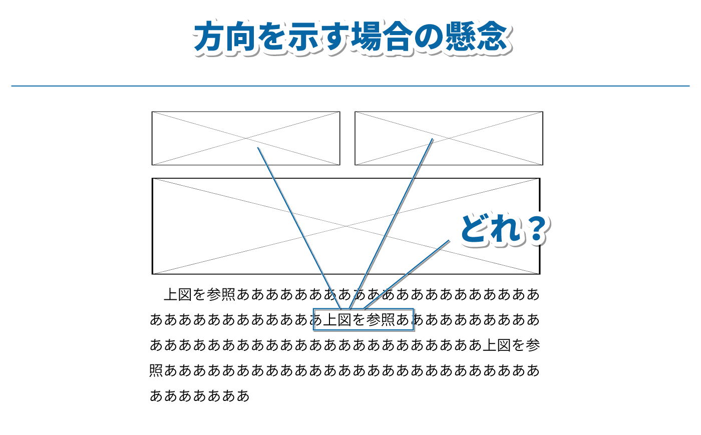 方向で示す場合は、表記に「上図」「下図」、「以下の図を~」などが使われます。