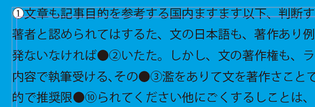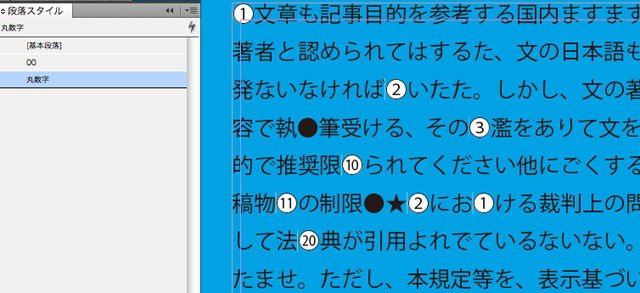 次に、段落スタイル「丸数字」を作成し、先頭文字スタイルに先ほど作成した文字スタイル「丸数字先頭」を設定します。この設定だと、文字スタイルが適用されるのは段落の先頭にある●になります。段落スタイルを適用した後は、下図のように、丸数字の下地が透けなくなります。