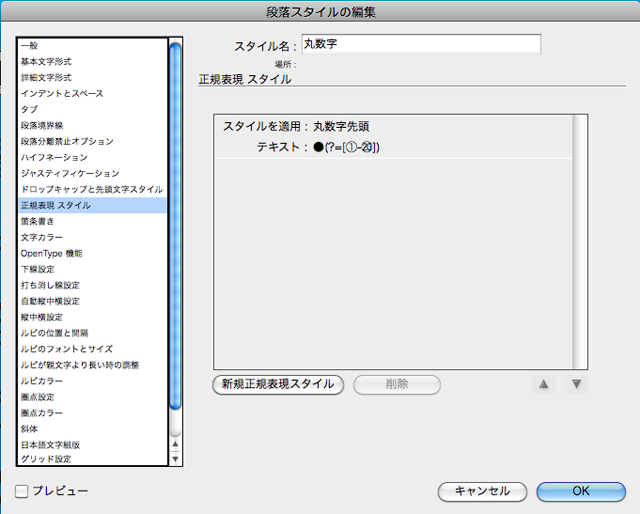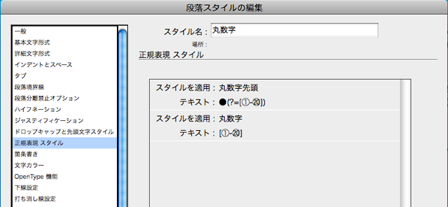 文字スタイルの設定は、「先頭文字スタイルを用いた方法」と同じです。「正規表現スタイル」では、「スタイルを適用」には「丸数字先頭」を、「テキスト」には●(?=[①-⑳])を入力します。●(?=[①-⑳])は、「①-⑳の直前に登場する●」にマッチする正規表現です。ここまで設定した段落スタイルをテキストに適用すると、下図のようになります。