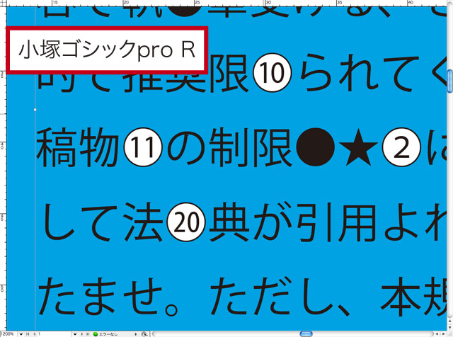 問題点は、「フォントによっては、●と丸数字とが完全に重ならない」ということです。以下に示した図では、「ヒラギノ角ゴpro W3」「ヒラギノ明朝pro W3」は、●の周りに隙間ができています。文字スタイル「丸数字先頭」は、「文字に線をつける」など、フォント毎の対応が必要になります。