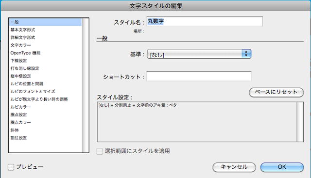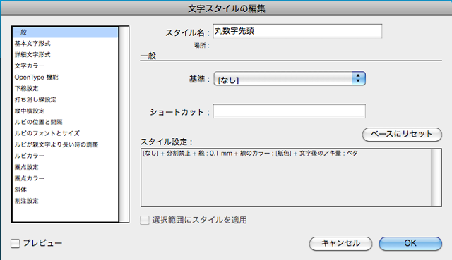 そこで、丸数字の前に「●」を入力し、文字カラー「紙色」、字送りに「-1000」を設定した「文字スタイル」を作成します。この2つ以外のパラメータは空欄にしておきます。これで、段落スタイルのフォント変更や文字サイズ変更等にも対応がききます。(ここではスタイル名を「丸数字先頭」にしています)