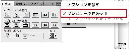 「整列」パネルのメニューに、「プレビュー境界を使用」という項目があります。