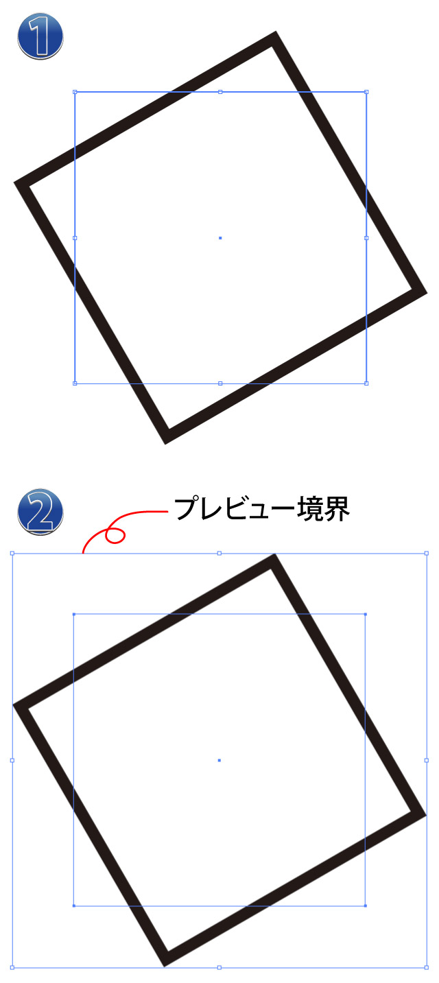 文章だと分かりづらいと思うので、以下の図をご覧下さい。①②共に、四角形を「変形」効果で30°回転させたものです。①は「プレビュー境界を使用」にチェックなしの状態、②は「プレビュー境界を使用」にチェックを入れた状態です。②の方には、オブジェクトのバウンディングボックスの周りに、もう一つバウンディングボックスが表示されています。これが「プレビュー境界」です。
